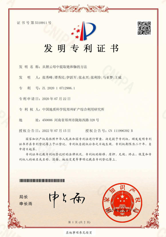 中国地质调查局郑州矿产综合利用研究所申请的“从锂云母中提取铯和铷的方法” 近日获发明专利授权。