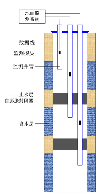 四是分层监测。混合监测不能真实反映各含水层特性。分层监测技术可根据钻孔分层数量及改建要求,将分层勘探孔改建为连续多通道多层监测井或巢式监测井,实现分层水文地质参数动态长期实时监测。